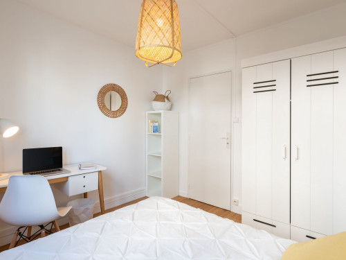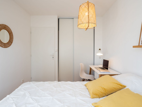Chambre se composant d'un lit double avec draps et oreillers, d’un bureau avec chaise, placard penderie avec serrure privative