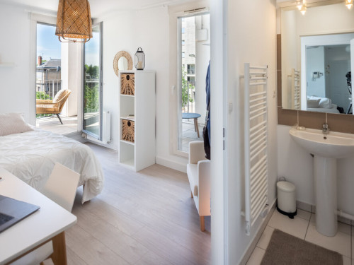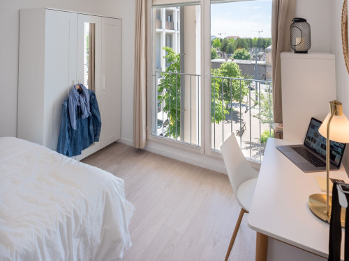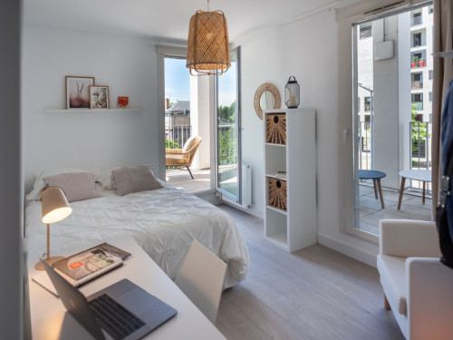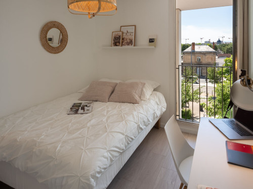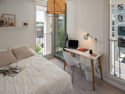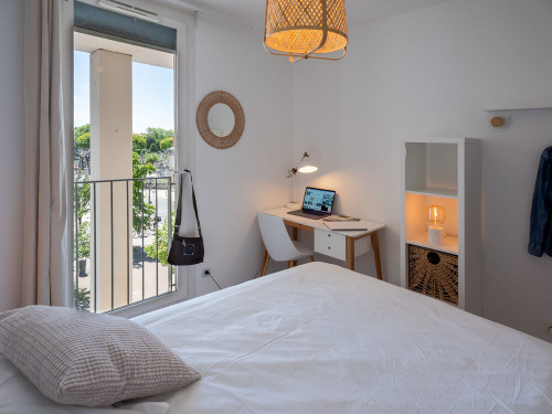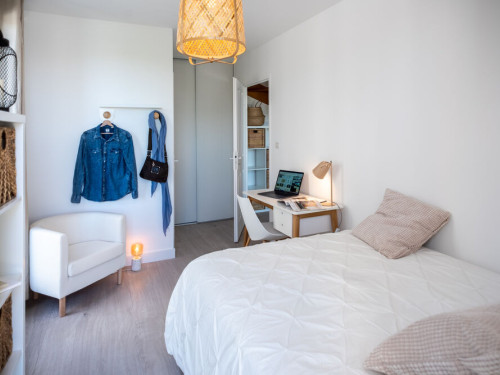 Chambre avec salle de bains privative, se composant d'un lit double avec draps et oreillers, d’un bureau avec chaise, placard penderie avec serrure privative