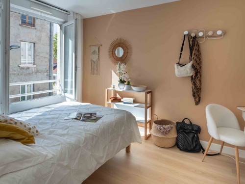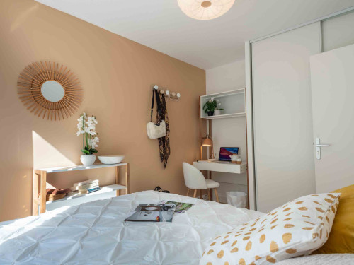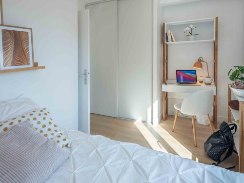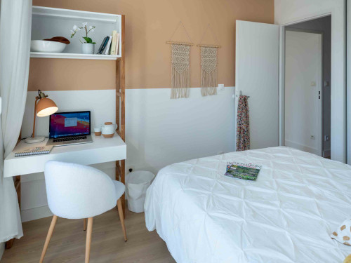 Chambre se composant d'un lit double avec draps et oreillers, d’un bureau avec chaise, placard penderie et serrure privative