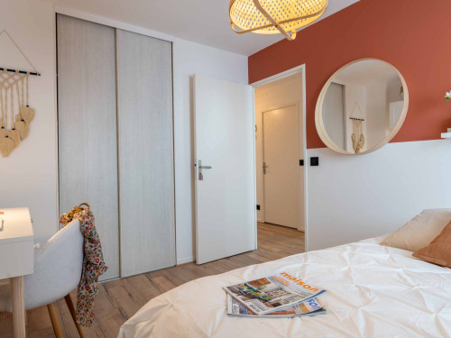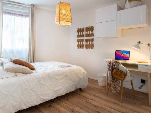 Chambre se composant d'un lit double avec draps et oreillers, d’un bureau avec chaise, placard penderie et serrure privative