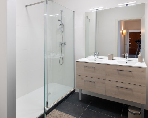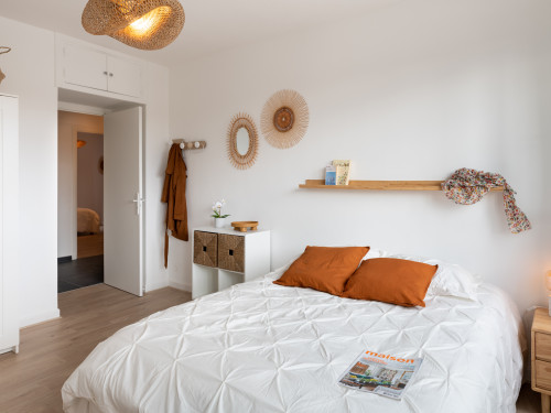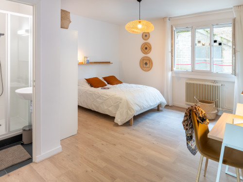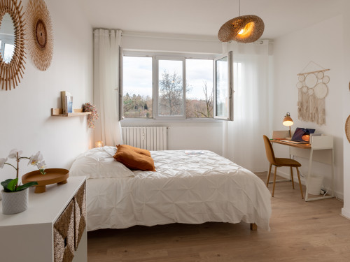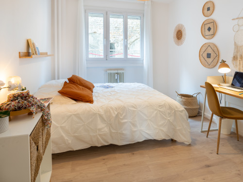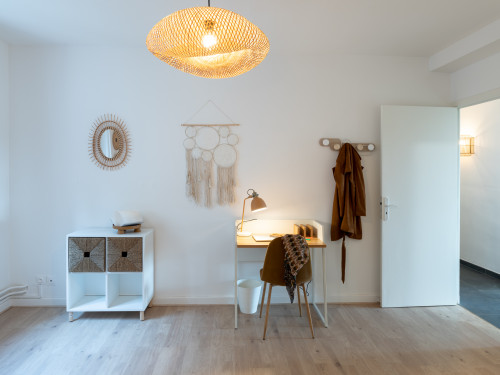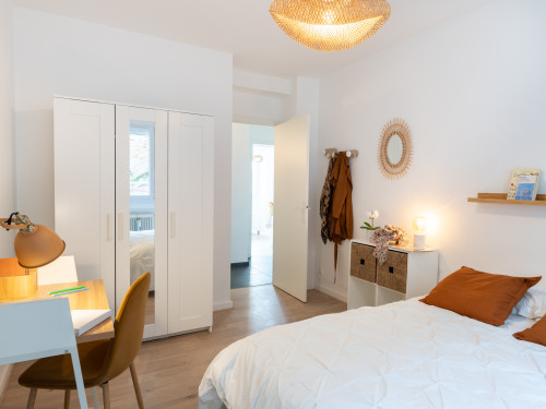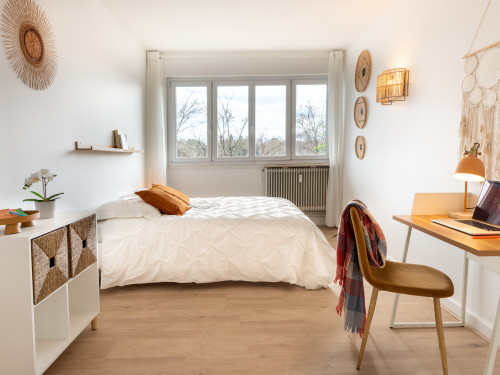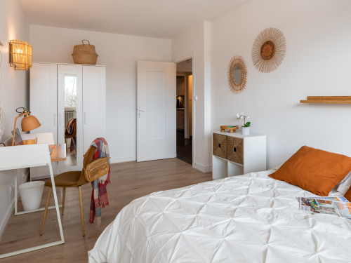 Chambre avec salle de bains privative, se composant d'un lit double avec draps et oreillers, d’un bureau avec chaise, placard penderie et serrure privative